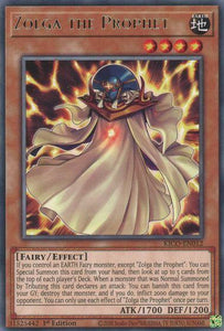 Card Text: If you control an EARTH Fairy monsterexcept "Zolga the Prophet": You can Special Summon this card from your handthen look at up to 5 cards from the top of each player's Deck. When a monster that was Normal Summoned by Tributing this card declares an attack: You can banish this card from your GY; destroy that monsterand if you doinflict 2000 damage to your opponent. You can only use each effect of "Zolga the Prophet" once per turn.